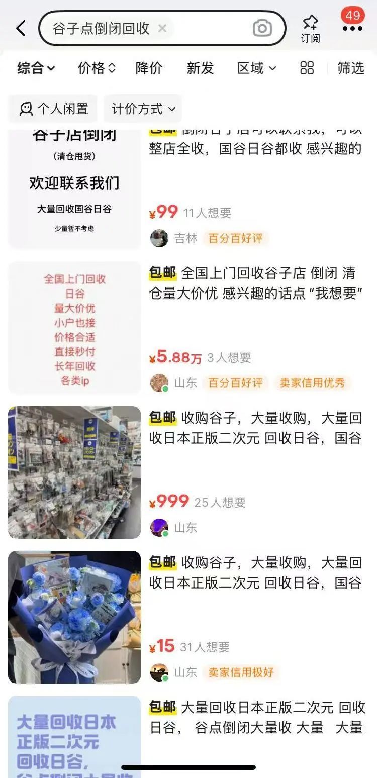 在全国范围内都有闭店的情况出现,有个体谷店老板告诉我们,近期已经决定低价转让店铺及所有商品,及时止损。面向这类亏损店铺,抖音与闲鱼上出现了“回收库存”服务,熟悉情况的行业人士告诉我们,这些库存会被以极低价格转卖给门店,“有些谷子店还需要用这些滞销货来撑满货架”。