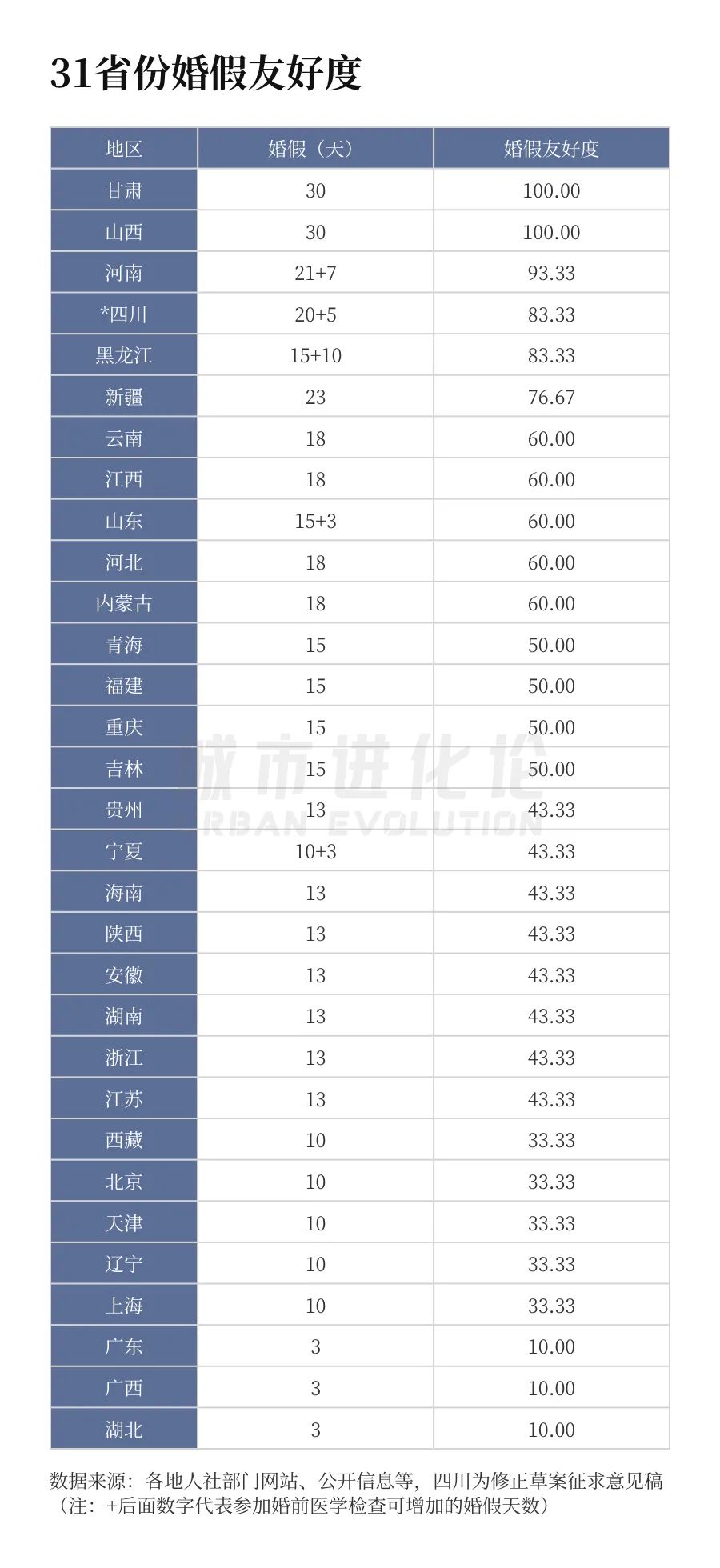 当然,更多的省份在取消晚婚假后,逐步调整了原有的婚假天数。根据城市进化论梳理,甘肃、山西婚假达30天,是全国婚假最长的省份。