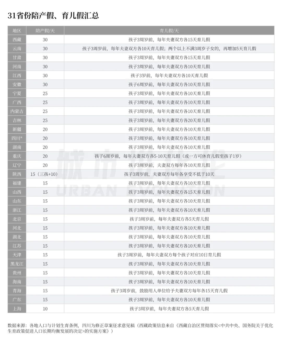 这也是各地积极落实生育支持政策的重要依据。根据2023年2月印发的《西藏自治区贯彻落实〈中共中央、国务院关于优化生育政策促进人口长期均衡发展的决定〉的实施方案》,西藏的生育假延长至365天,陪产假延长至30天,育儿假延长至15天,是目前全国生育假最长的省份。