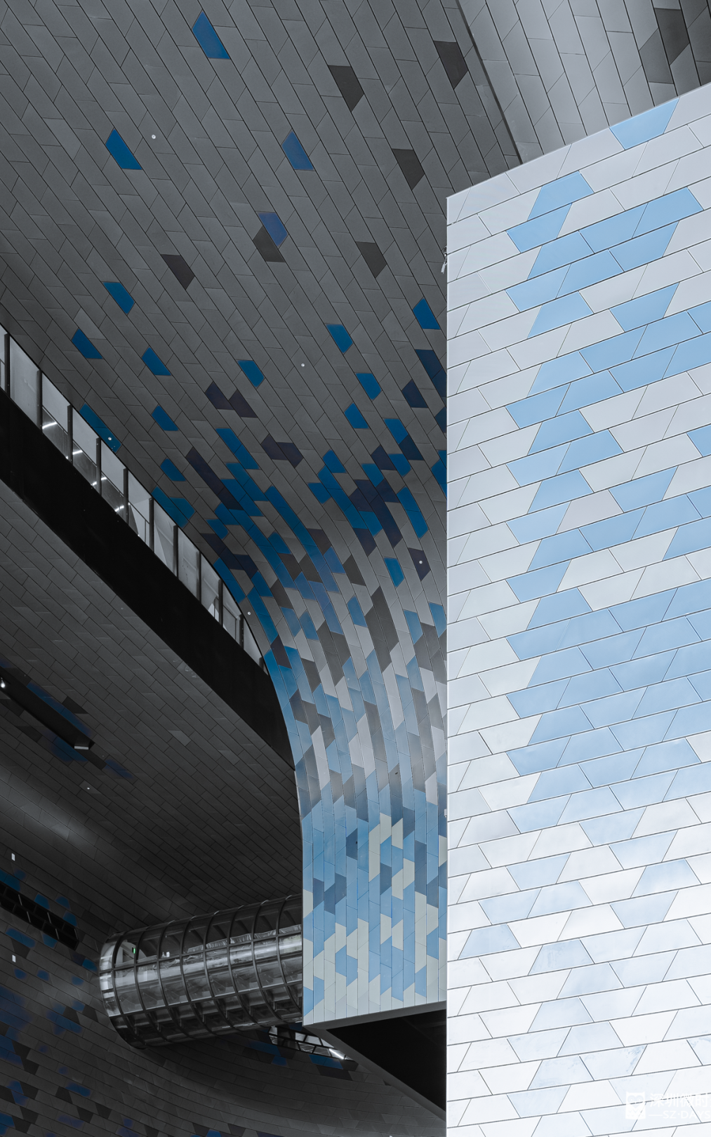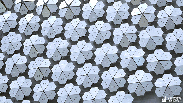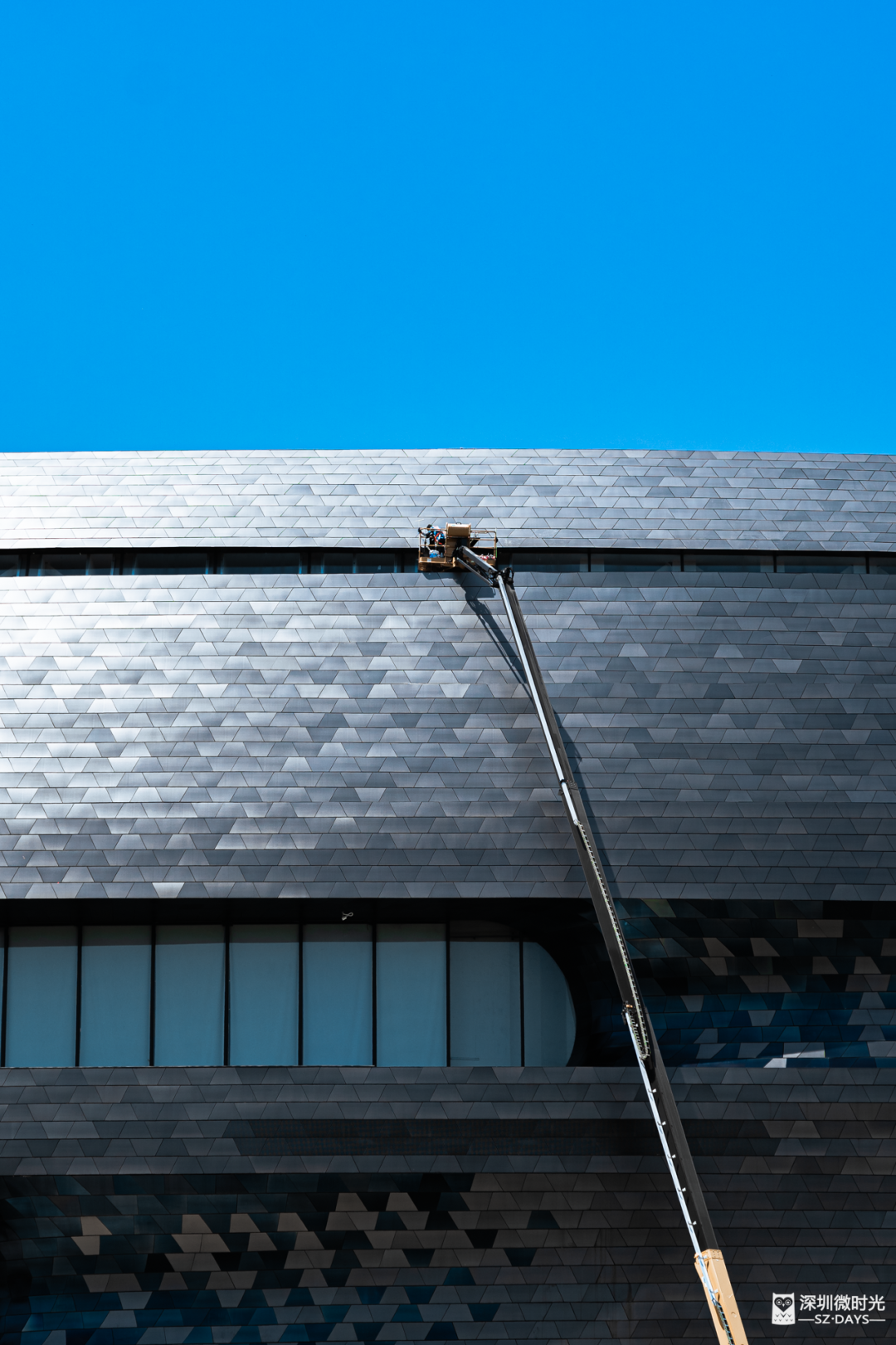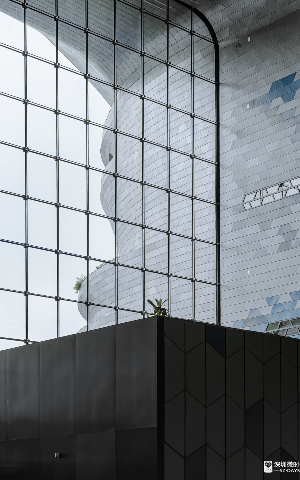 根据介绍,深圳科学技术馆正是以“宇宙飞船”为灵感,与其本身的科学技术主题属性相互契合。外围的金属幕墙还会随着光线变化,产生从蓝到灰的渐变。