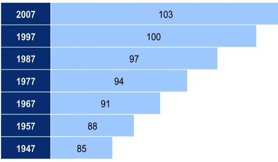 因此,人的衰老比我们的普遍认知要早,但衰老的过程非常缓慢,事实上,随着世界和平的延续、科技和医疗水平的提高,人类的预期寿命正在不断延长。如1949年,我国的平均预期寿命只有34岁,如今则达到78岁的水平。国外一项大数据统计表明,人类每隔10年,平均预期寿命就可以增长3岁。如1977年出生的人,预期寿命为94岁,1987年出生的人,预期寿命则可以提高到97岁了。