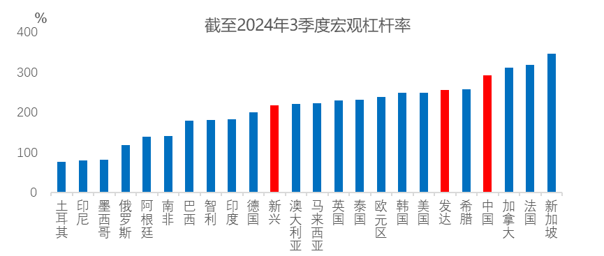 截至2024年三季度,发展中国家的平均宏观杠杆率为217%,发达国家为255%。而国际金融研究所(IIF)的报告显示,2024年,全球债务额(包括政府、家庭、金融和非金融公司的负债)将增加7.2万亿美元,达到318.4万亿美元。
