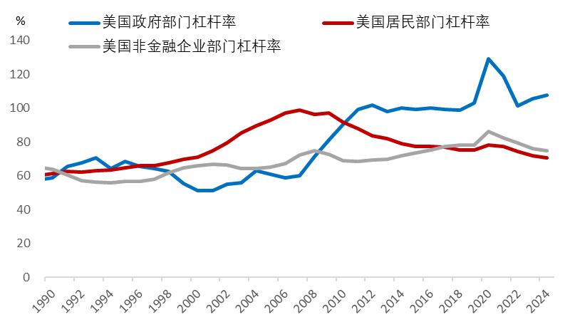 美国联邦政府杠杆率水平的大幅提升,一次发生在2008年的次贷危机时期,从60%提高到了100%以上;另一次是在2020年的疫情期间,从100%提高到了最高129%。而在这个过程中,企业和居民部门都在降杠杆。