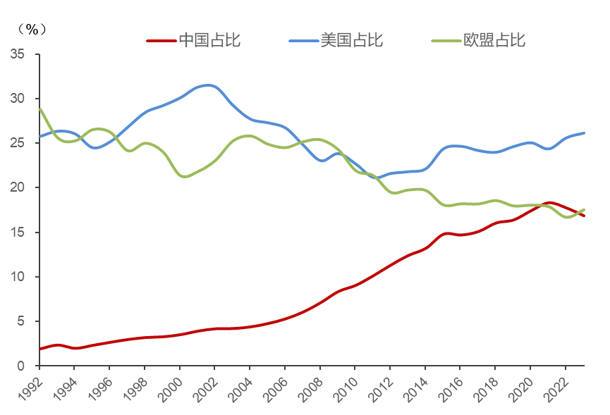 三大经济体GDP占世界比重(美元计价)(%),来源:Wind,中泰证券研究所