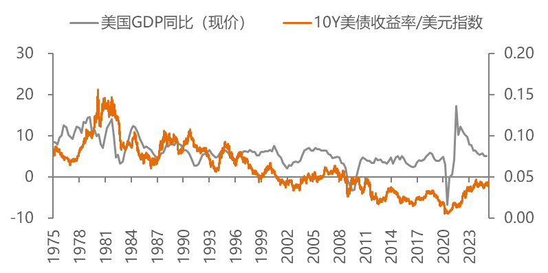 美国GDP增速与美债收益率/美元指数的关系,来源:Wind,中泰证券研究所