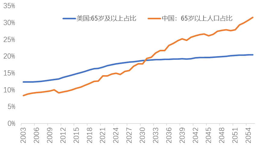 中美人口老龄化率趋势预测,来源:Wind,中泰证券研究所