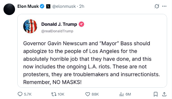 和解信号还在继续出现:美国周日晚间,马斯克在争吵后首次转发特朗普的Truth Social发帖,似乎支持特朗普政府关于洛杉矶移民抗议活动的处理方式。