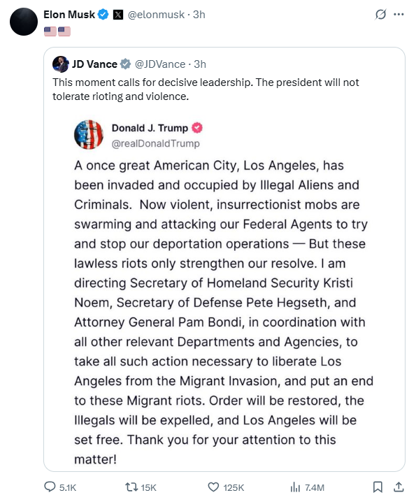 他还转发了另一则特朗普的帖子,其中写道,加州州长纽森和洛杉矶市长巴斯应对洛杉矶人民道歉,他们糟糕的工作也是导致这场骚乱的原因之一。参与者并非抗议人士,而是骚乱分子和叛乱分子。