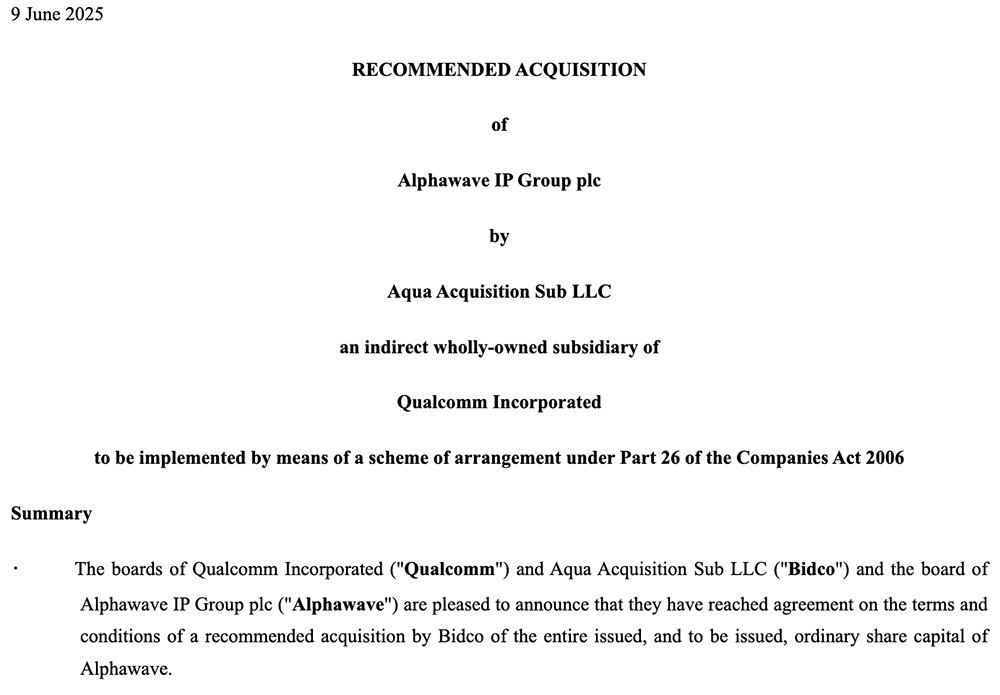 Alphawave股东可选择以现金或高通股票形式接受报价。根据收购条款,接受收购的Alphawave股东将有权获得每股2.48美元现金,比高通披露收购意向前的收盘价溢价近96%。