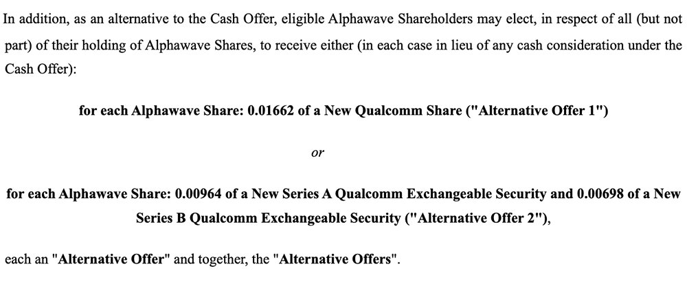 股东还可以选择以每股Alphawave股票换取0.01662股高通新股。每股Alphawave股票可兑换0.00964股新的“A系列高通可交换证券”和0.00698股新的“B系列高通可交换证券”。该可交换证券在4年锁定期内不上市且不可转让,并将在16个季度发行日内逐步转换为高通股票。
