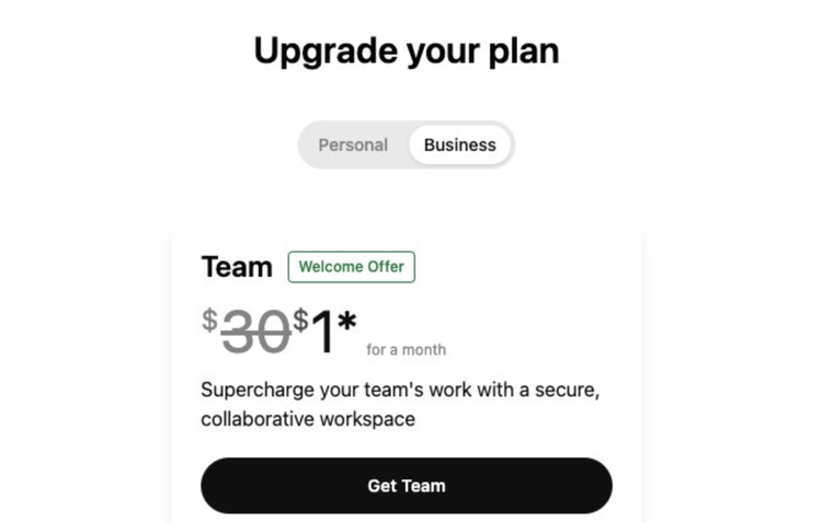 不只是Perplexity,OpenAI也在悄悄放出Team会员首月1美元的优惠,最多支持5个席位,算下来人均一块四人民币。