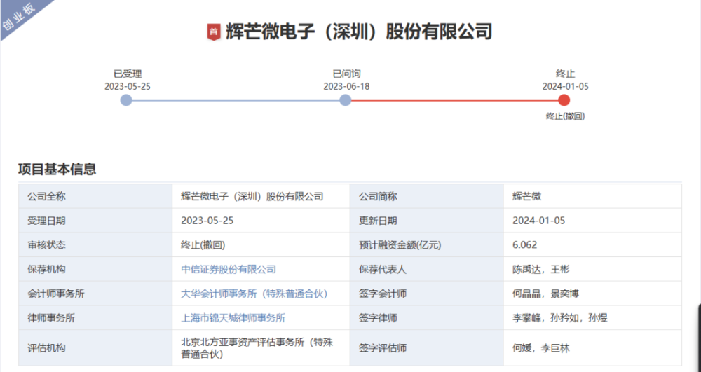 2024年1月,辉芒微在深交所创业板上市的审核状态变更为“终止”,原因为辉芒微及保荐人中信证券申请撤回发行上市申请文件。2022年初,辉芒微和中信证券也曾主动撤回过上交所科创板的IPO申请。