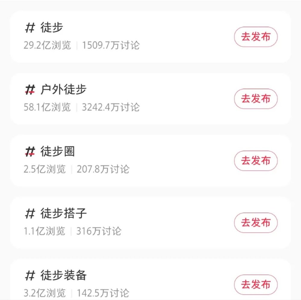 在小红书上,徒步相关话题浏览量前五位,来源:小红书