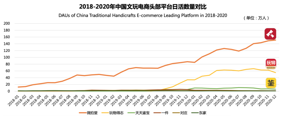 根据《报告 》显示,近两年来,在头部的文玩电商APP中,微拍堂的日活增长最为明显。截至去年12月,其日活用户数已接近第二名的三倍,处于第一梯队;新玩家玩物得志与天天鉴宝,抓住了直播电商的红利且因疫情期间发展迅速,处于第二梯队;对庄、一件等其他平台,虽然起步也相对较早但发展并不如意,日活用户不足五万,处于第三梯队。