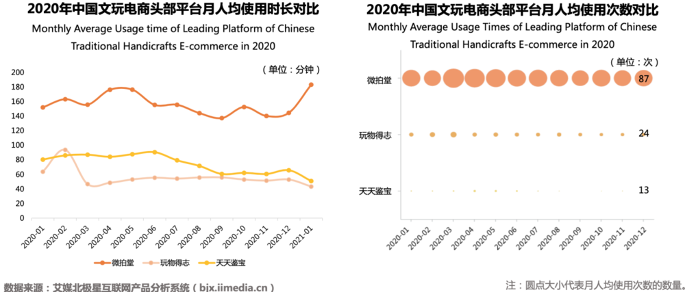 而从用户粘性角度来考量,微拍堂也展现出了较大的领先优势。一方面,在月人均使用时长和月人均使用次数上,微拍堂显著领先玩物得志与天天鉴宝,而后两者之间的差异相对不大。