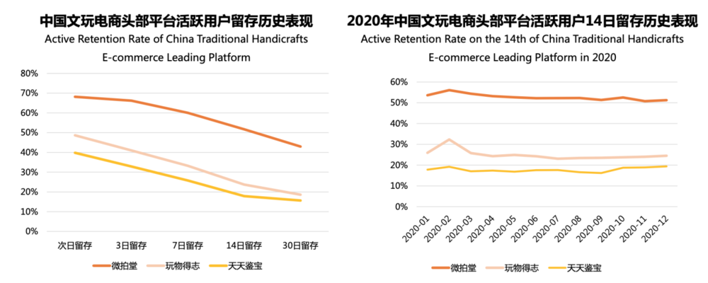另一方面,从用户留存数据来看,微拍堂的用户14日留存率保持在50%以上,玩物得志大约为25%,天天鉴宝则低于20%。