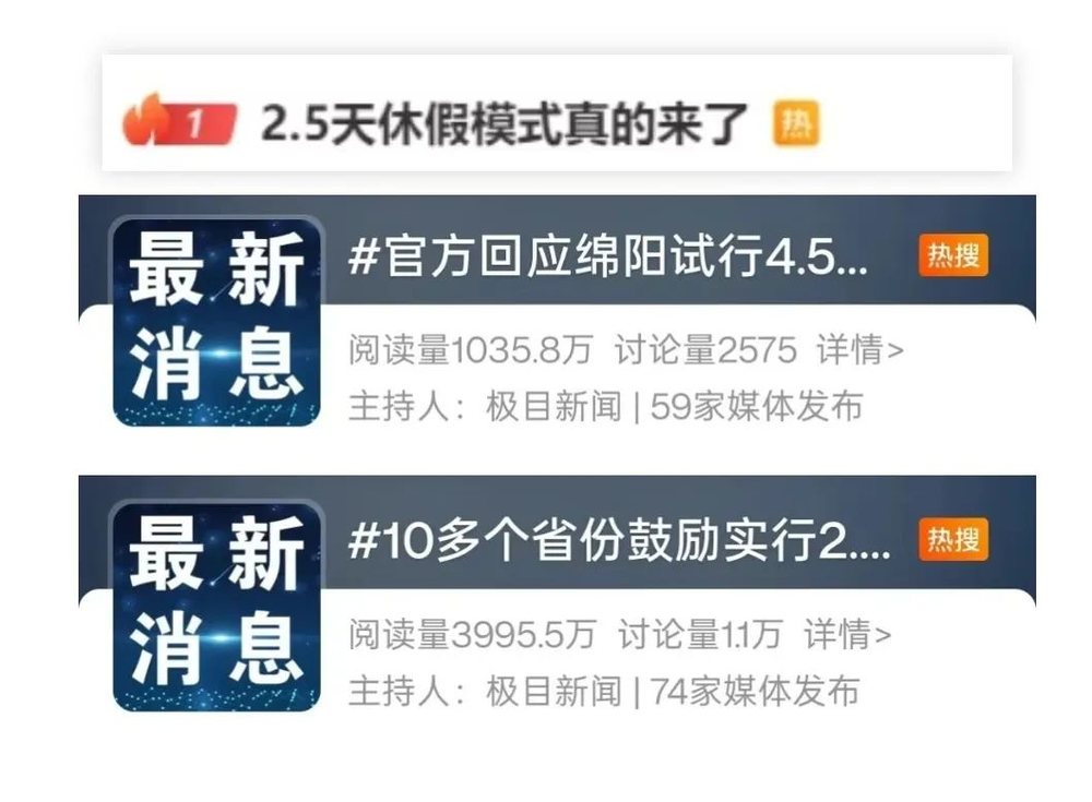 在“全国10余个省市明确提出鼓励有条件的地方和单位实行2.5天的休假模式”的评论区,最多的评论是:“先保证2天休息制落实再说”、“工作时间短了、工资少了、生活压力怎么办?”