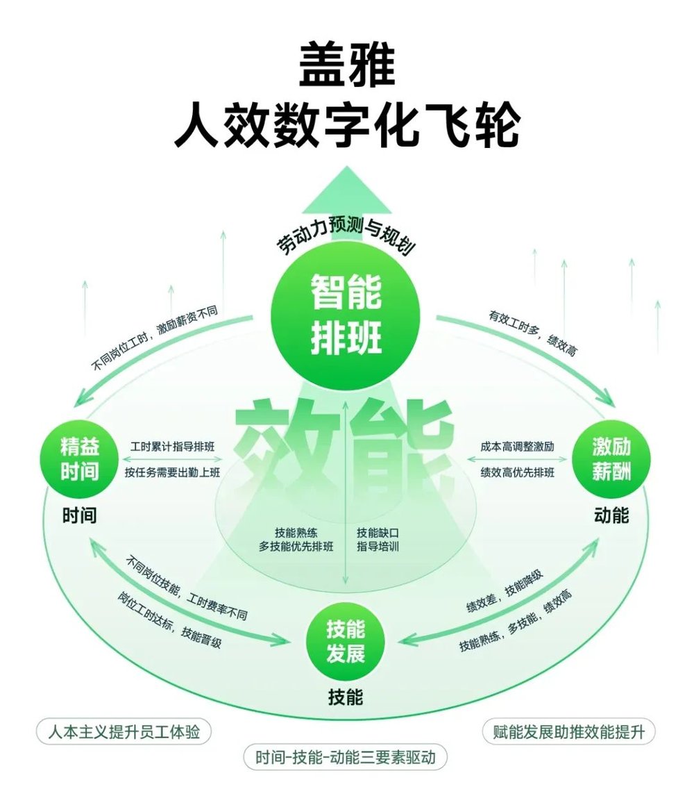 这说明,人效提升是系统工程,也绝不是简单的“缩短工时”就万事大吉的逻辑,必须得找到企业和员工双赢的路子。盖雅提出的“人效数字化飞轮”,从时间、技能、动能三个维度综合发力,真正达到员工和企业双赢的人效飞轮。目前,这个飞轮已经在雀巢、OPPO、大华、德赛西威、太古可口可乐等优秀的头部企业获得了标杆验证,得到了不错的ROI数据。