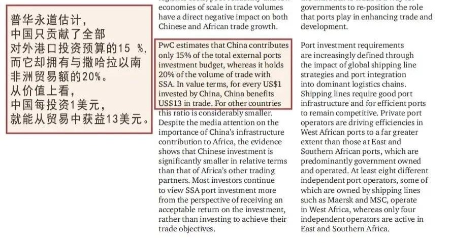事实上,中国在非洲建设基础设施,在造福当地的同时,也将给我国带来巨大的经济收益。据全球著名咨询服务公司普华永道估算,中国每向非洲港口投入1美元,可获得高达13美元的贸易收入,这是一种典型的“双赢”。
