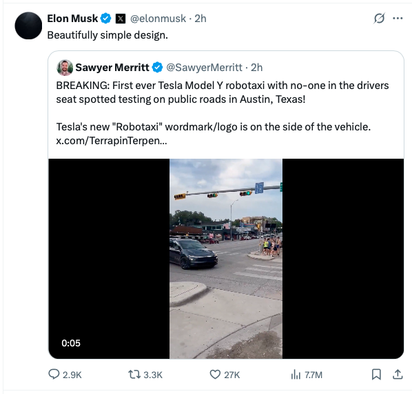 视频中,一辆黑色的Model Y在奥斯汀著名旅游区南国会大道(South Congress Avenue)附近行驶,车门上标有“robotaxi”字样,后方还跟有一辆看似用于支援的车辆。这段视频发布在马斯克的社交平台X上,马斯克本人也在其账号上进行了转发。