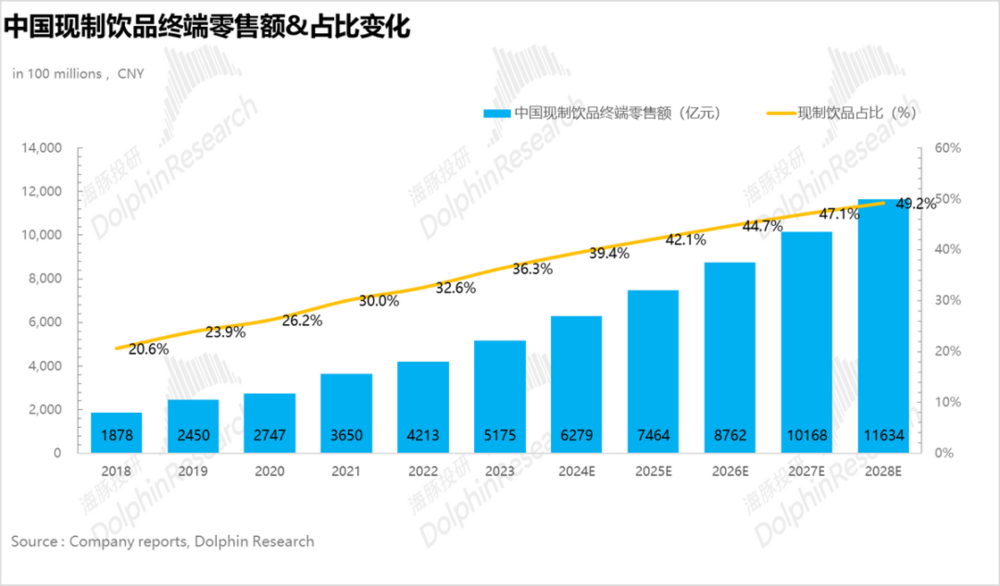事实上,海豚君在《“现饮界拼多多”蜜雪冰城 :“雪王”封王底气何在?》说过,近年来随着以蜜雪冰城为代表的现制饮品纷纷通过自建供应链,不断压低产品价格,使得现制饮品在整个软饮里占比显著提升,从2019年24%提升到当前接近40%的比例,且根据蜜雪招股书里的预测,2028年现制饮品比例有望达到50%。