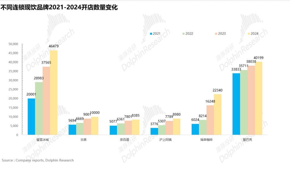 我们按照蜜雪冰城主品牌和咖啡品牌——幸运咖分别测算。截至2024年底,蜜雪冰城在国内共约4.2万家门店,其中蜜雪冰城和幸运咖分别为3.8万家和0.4万家。
