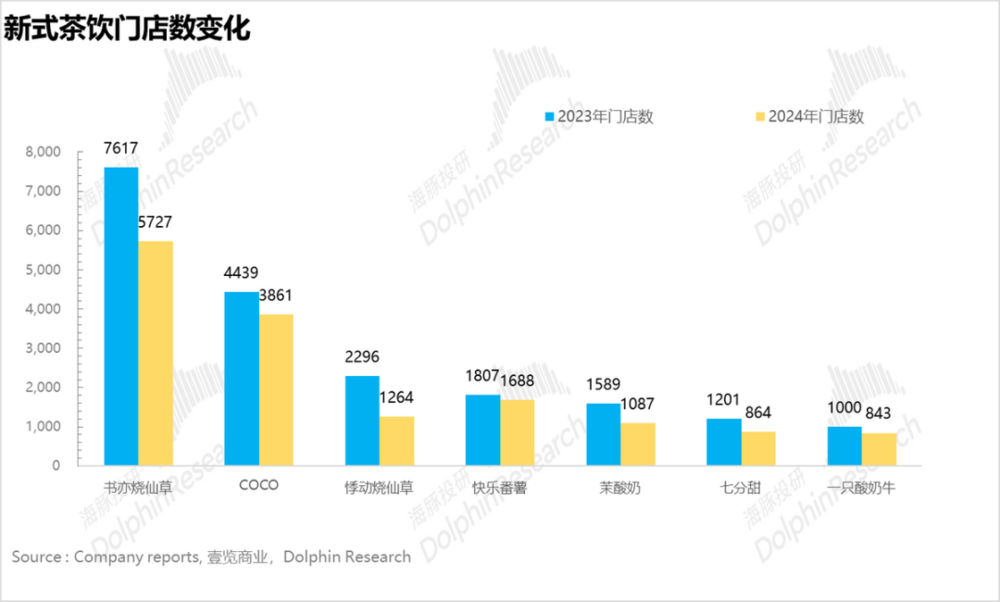 在激烈的价格战下,由于多数中小品牌的原料依赖第三方代工,原料采购成本较高,因此如果不能给予加盟商同等的优惠补贴力度,伴随单店GMV下降就会导致加盟商的回本周期延长、部分扛不住的加盟商自然会选择退出。从下图可以看到7个千店级别以上的连锁现制茶饮品牌在2024年已经出现了门店的负增长。