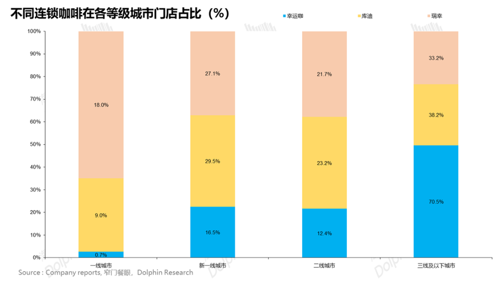 从下图可以看到幸运咖在三线及以下城市占比超过70%,远高于瑞幸、库迪。