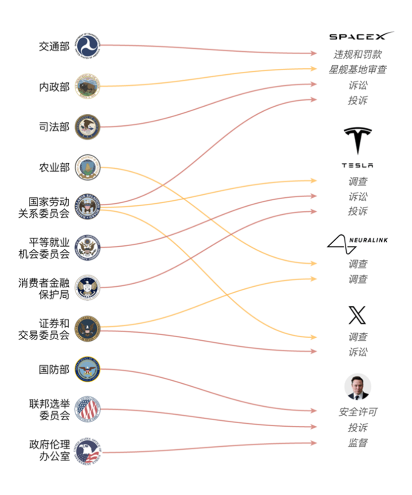 马斯克拥有的科技与商业帝国,至少包括SpaceX、Tesla、xAI、X,以及NeuraLink和Boring等公司。每一家公司都代表了马斯克对未来的想象,星际文明、能源革命、人工智能、超级应用,以及未来的人类与未来的交通。在马斯克“住进”白宫前,这些企业面临着来自11个联邦机构的32项持续调查、未决投诉或执法行动。在蜜月期间,一切都暂停了,但如果马斯克想叫板特朗普的话,一切也可以对他全面启动。