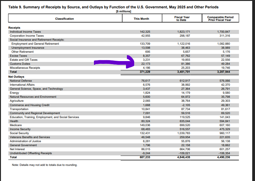 但目前看我觉得还有一个地方在于,美国海关可能没收上来这么多税。五月份美国已经完全进入了关税期,而五月份美国海关总共收了220亿美元。