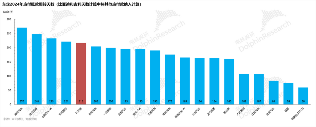 然而,在我们拉出来的一众汽车公司中,2024年仅特斯拉一家60天账期达标。中国车企平均应付账款周期长达5-6个月(比亚迪近7个月,海马/北汽蓝谷达8-9个月)。