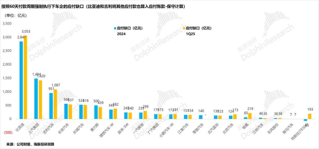 b.再用公司当期报表上的实际应付账款金额,去减掉按照60天周期下的应付金额,二者差值就是改为60日应付账款账期后,各家车企需要还给供应商的金额。海豚君把这个差值暂且称为“应付缺口”。