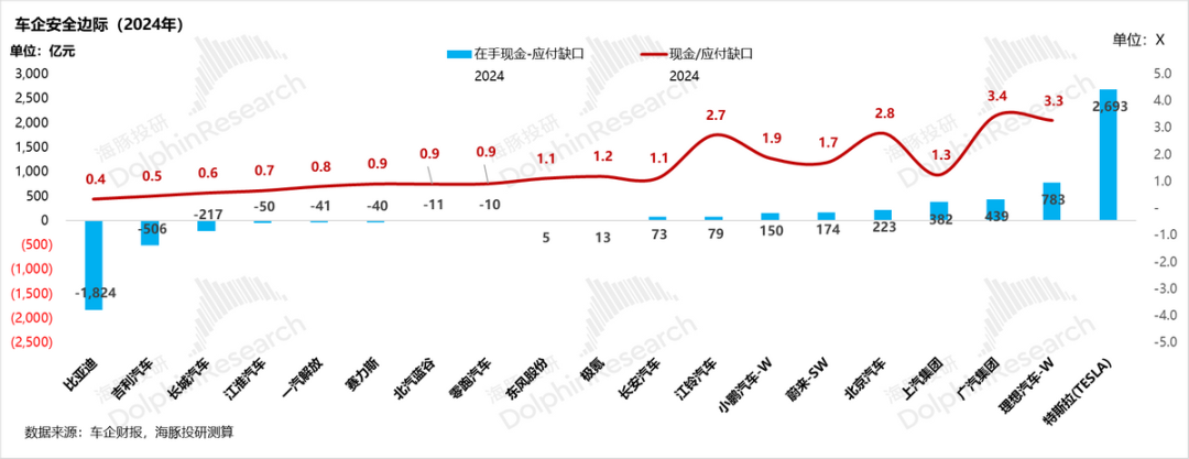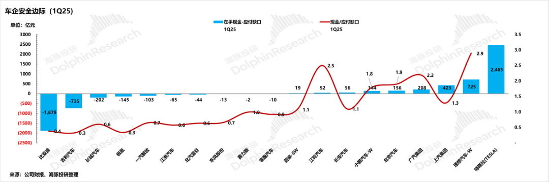 1)最安全第一梯队,安全边际最高:特斯拉(本身账期短+高在手现金)和理想(经营现金流充裕),在手现金完全能覆盖应付缺口,还能用一定现金剩余来应对日常经营,完全无需额外债券或者股权融资;