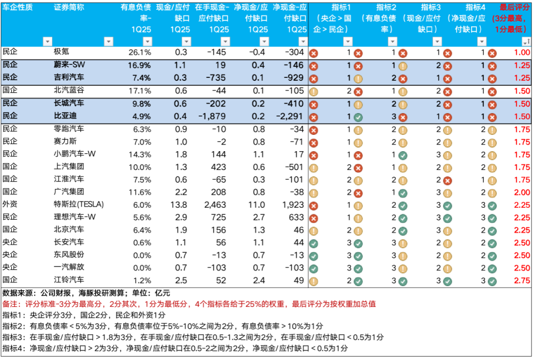 同时踩中这三类情况的车企,可能会是极端负面情形下再融资风险最大的玩家,海豚君通过罗列的4个指标进行评分(见下图:4个指标各给于25%的权重,最后评分按权重加总值从低到高排序),风险最高的车企是:蔚来汽车,吉利汽车,长城汽车,比亚迪。