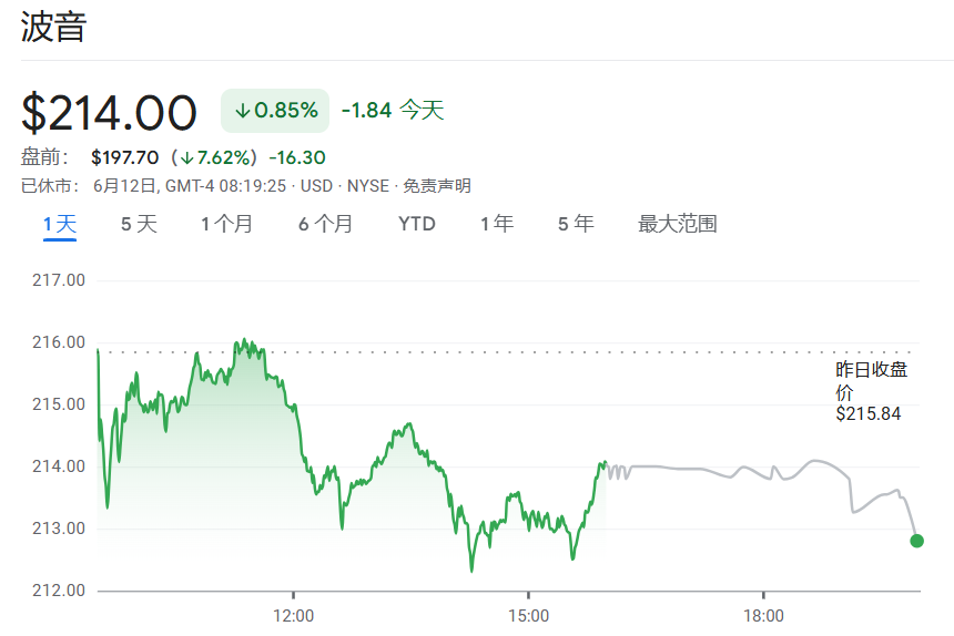 受事故影响,截至发稿,波音公司股价在美股盘前交易中下跌7.62%。