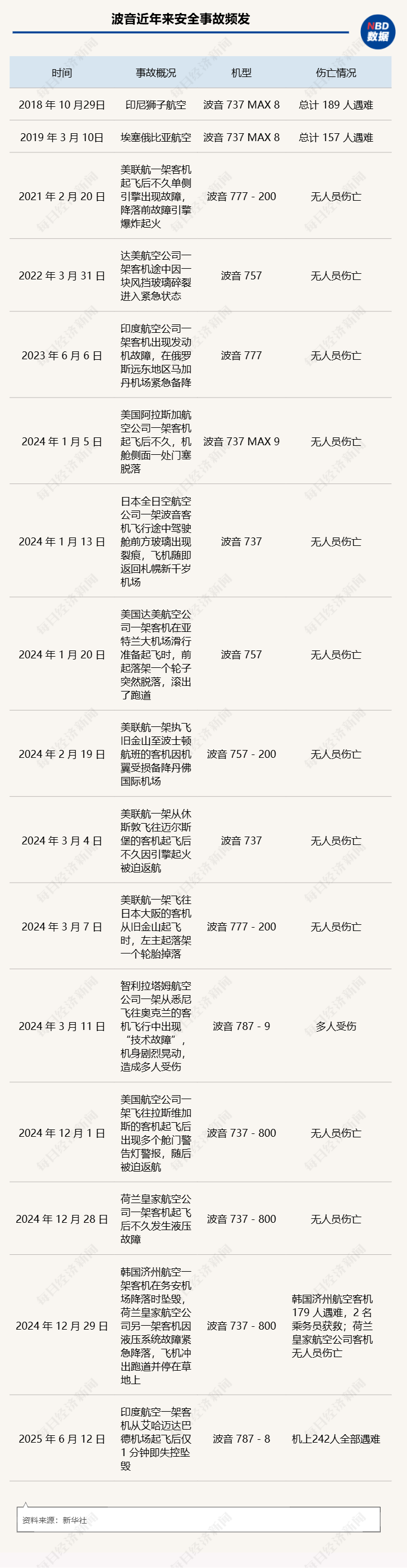 近年来,波音已深陷财务困境。从2019年至2024年,该公司累计亏损高达359.91亿美元,创下其108年历史上的最大六年亏损纪录。这起空难的发生,无疑为波音本已严峻的危机再添阴霾。