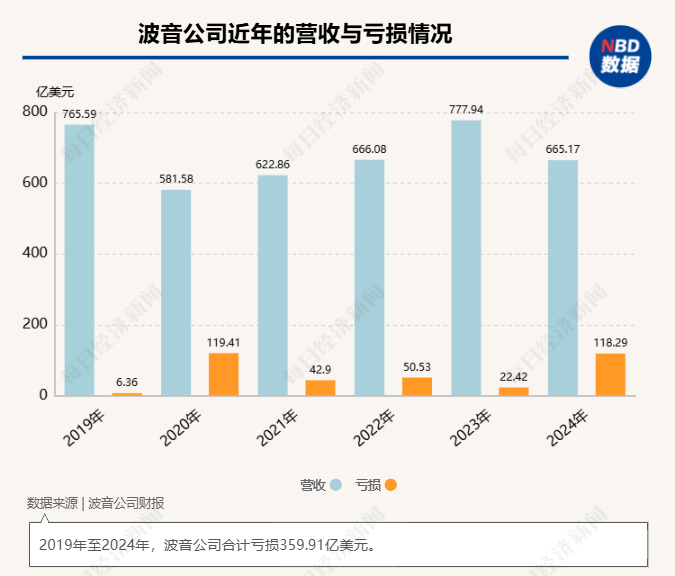 从2019年至2024年这六年时间,波音合计亏损高达359.91亿美元,创下了成立108年来的最大六年亏损纪录。