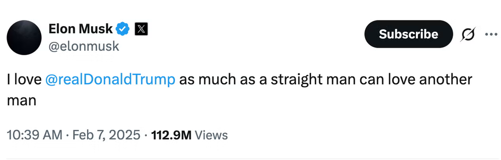 兄弟和情侣一样,总会有人爱得更深。马斯克显然是投入更多的那个。他会在社交媒体上公开示爱特朗普,称这是“直男之间的爱”。考虑到马斯克在婚姻和感情的过往,完全可以相信,他对特朗普的爱戴远超对伴侣的男女感情。他会大谈自己在白宫过夜时的激动,甚至吃光了一桶焦糖冰淇淋。(作为南非移民,他不可能以主人身份住在白宫。)