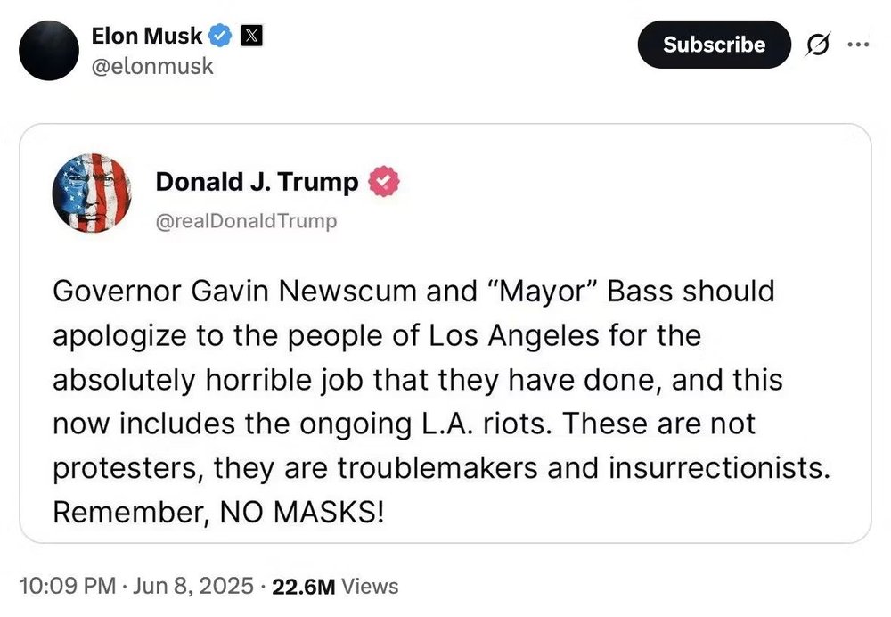 马斯克近几天的X动态更多集中在谴责洛杉矶的骚乱上,与特朗普以及共和党人保持着高度一致。这种公开站队的姿态,也得到了特朗普政府的认可。接下来则是昨天马斯克的公开致歉,宣布自己对上周的一些过激言论感到悔恨。
