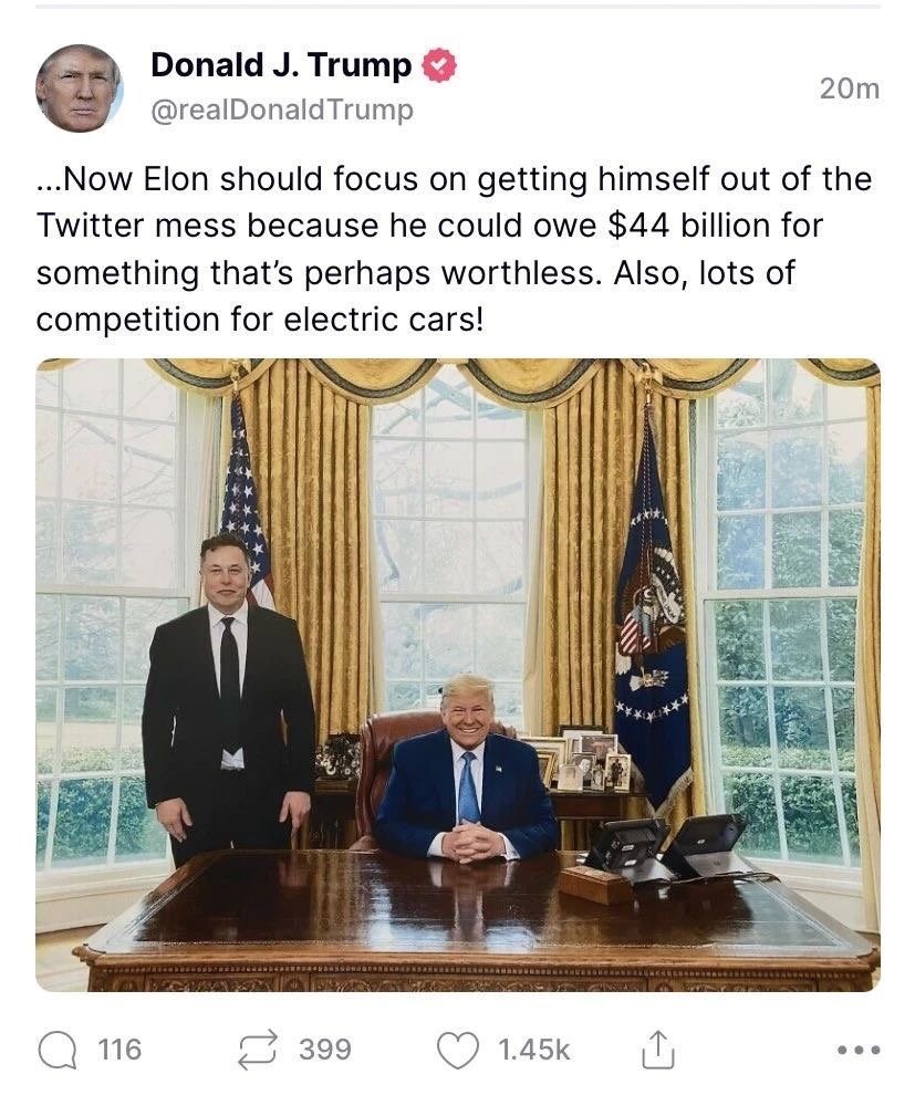 正好是一周之前,全世界都搬着板凳马扎,刷着社交媒体,当起了吃瓜群众,欣赏了一段前所未有的世纪对撕。这一方面是因为双方的至尊地位,世界最有财富的人与最有权势的人;另一方面是因为他们的流量,都拥有自己的社交网站,都是全球头部网红,也都擅长和沉迷在网上撕人。