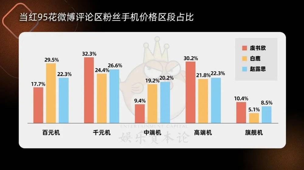 当下炙手可热的95花白鹿、赵露思、虞书欣三人一直以来在实绩上难分高低,不过体现在手机价格数据上则是值得一说,相对来讲,白鹿和赵露思的占比分布比较接近,虞书欣则在旗舰机和高端机部分占比更高,达到40.6%,或许去年《永夜星河》的火爆为她带来了新的一波有着相当消费能力的氪金粉丝。