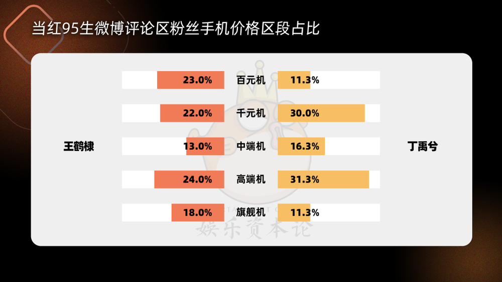 同为虞书欣CP,早几年荣升流量,目前已经手握一番男频剧的王鹤棣和去年刚刚飞升的丁禹兮的价格占比有些差异但不多,王鹤棣在旗舰机占比方面较为突出,达到18.0%。丁禹兮则是在高端机占比方面较为突出,达到31.3%,可见粉丝都有着一定消费能力,不知如果他们成为同一品类的代言人,究竟谁胜谁负。