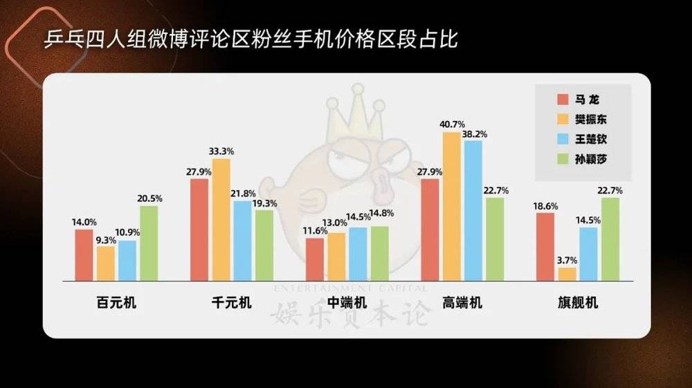 而回到乒乓球运动员马龙、樊振东、王楚钦、孙颖莎这边,王楚钦在旗舰机和高端机方面成绩相当突出,不过分看这两部分,孙颖莎的旗舰机占比为22.7%,樊振东的高端机占比为40.7%,其实各有所长,想要分出个上下高低,还得留待日后观察。