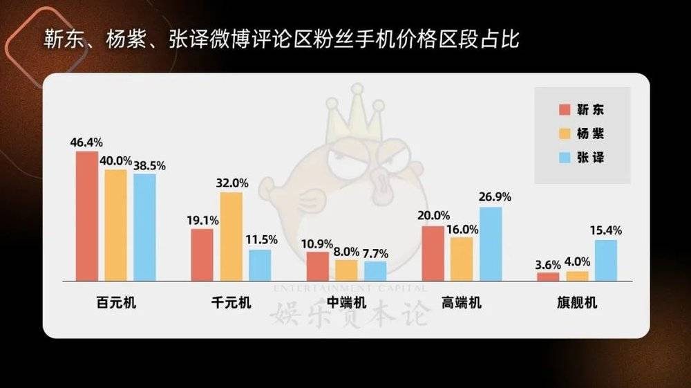 而在价格最低的百元机部分,靳东、杨紫、张译等占比均较高,其中最高的则是足有46.4%的靳东,这说明他的粉丝相当注重性价比,也和大众认知中,他的粉丝多为中老年女性的粉丝画像并不相悖。