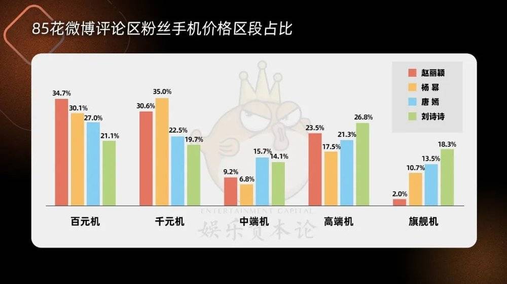 赵丽颖、杨幂、刘诗诗、唐嫣四位85花里,赵丽颖和杨幂百元机和千元机相加的占比分别为65.3%和65.1%,唐嫣和刘诗诗也有49.5%和40.8%,都超过26人的平均值。不过她们的高端机占比都仅次于百元机和千元机。这说明了她们一方面有一批具有一定消费能力粉丝,一方面也受到下沉市场欢迎。