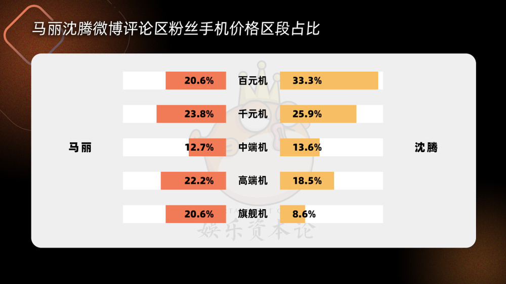 另外,马丽的数据相当亮眼,粉丝旗舰机占比20.6%,高端机占比22.2%相加起来为42.8%,在统计的26人里,这两项数据相加的占比高于大多数人,比近两年势头很好的95生王鹤棣和丁禹兮等都要高,也是远远高于搭档沈腾的27.1%。喜剧演员,尤其是女性喜剧演员粉丝通常被认为消费力中等,但从数据可以看出,她吸引到了一批消费能力较强的粉丝。