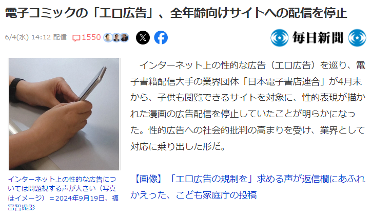其实,日本的电子书店已经开始行动了。2025年4月底,由11家大型电子漫画平台组成的“日本电子书店连合”宣布,停止向“全年龄”网站投放带有性描写的广告。这波操作直接回应了“日本广告审查机构”(JARO)的投诉——2024年,JARO收到了604件关于网络色情广告的投诉,比前一年翻了一倍多,其中一半以上跟电子漫画有关。连合的决定让投诉量在5月后几乎清零,效果立竿见影。