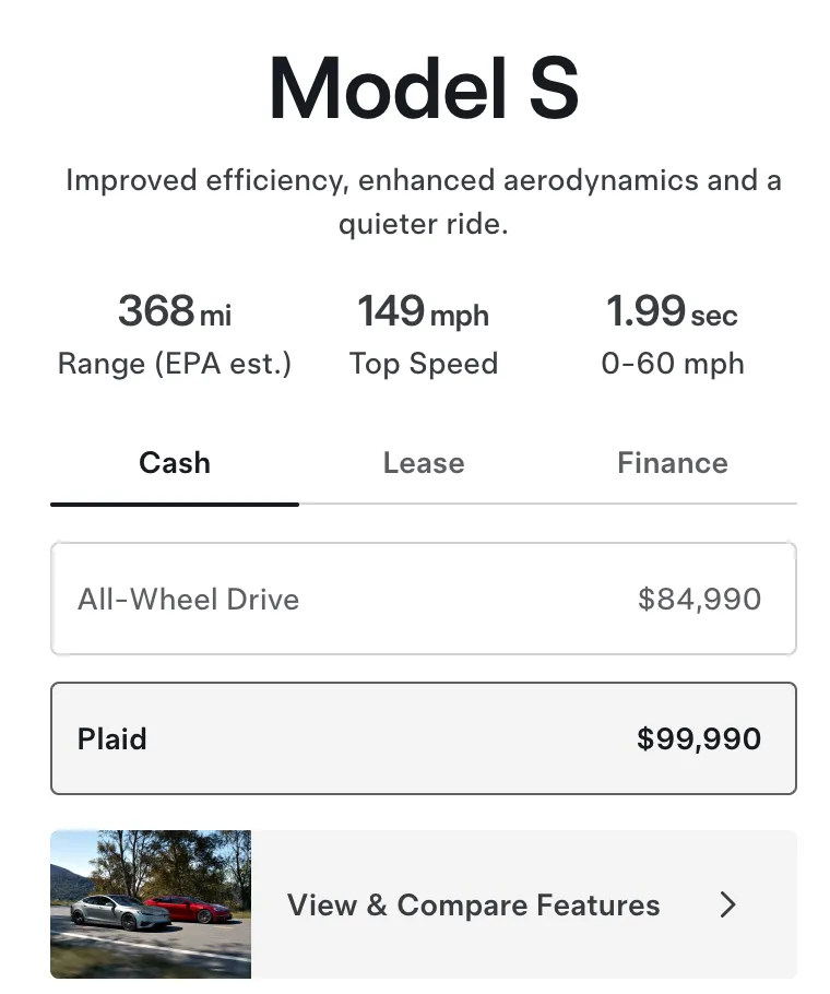 同时,Model S/X各个版本售价都上涨了5000美元,现在Model S全轮驱动和Plaid车型的售价分别为$84990(约合人民币61万元)和$99990(约合人民币71.7万元),Model X的售价则来到了$89990(约合人民币64.6万元)和$104990元(约合人民币75.3万元)。