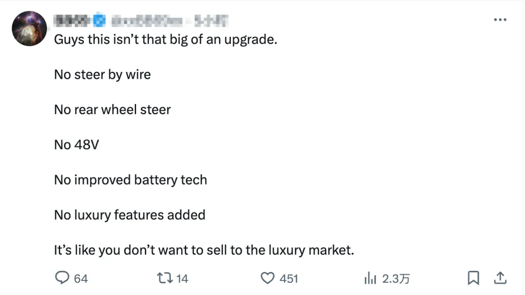 这并不是一个大的升级。没有线控转向。没有后轮转向。没有48V。没有改进的电池技术。没有添加豪华功能。你似乎并不想在高端市场销售它。