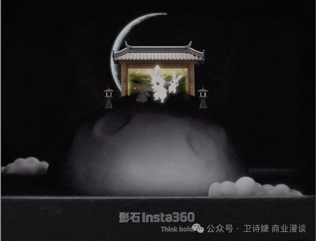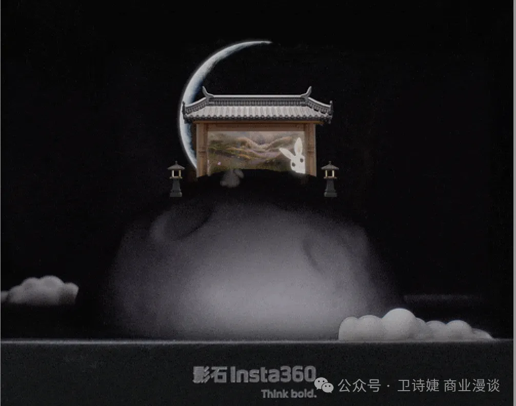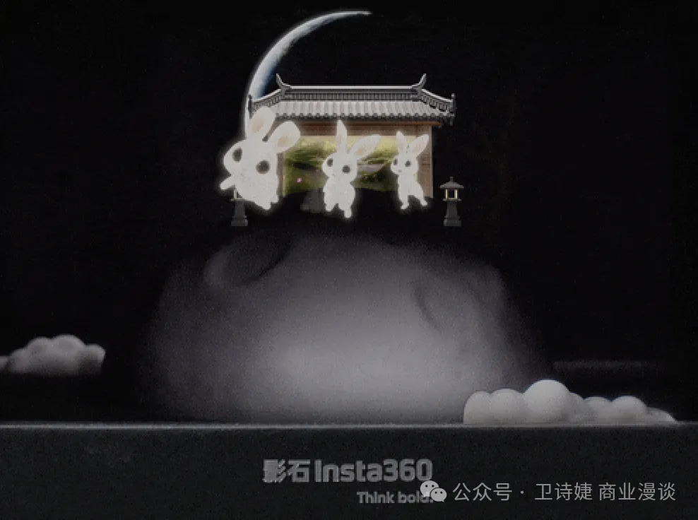 我关上灯,接通电源,盒子里响起八音盒的乐声,三只白色小兔子从盒身边缘的镜像屏幕中探出脑袋、跃出、飞起来——象征着从地球,到月球。多么像他们的全景相机,这些年先是被绑在了老鹰身上,接着被绑上火箭、卫星(是的,影石为此掏钱买了一颗卫星),最后冲出了地球,拍下它与月球 360 度的全景合影。
